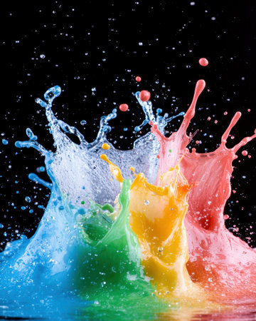 A vivid and dynamic scene of colorful liquids splashing against a dark background, creating a mesmerizing burst of hues.