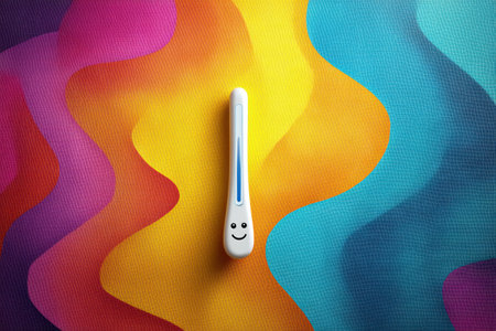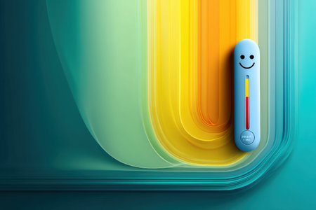 A digital thermometer with a smiling face stands proudly on a colorful gradient backdrop, radiating warmth and positivity in a home setting.