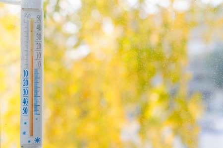 The thermometer on the window in autumn and warm day amid the yellowed leaves