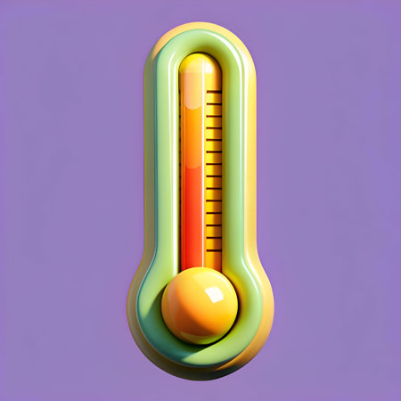 A playful 3D illustration of a thermometer. rendered in bright yellow and green with a red mercury level. Perfect for adding a whimsical touch to designs about weather. temperature. and summer.