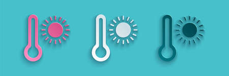 Paper cut Meteorology thermometer measuring heat and cold icon isolated on blue background. Thermometer equipment showing hot or cold weather. Paper art style. Vector