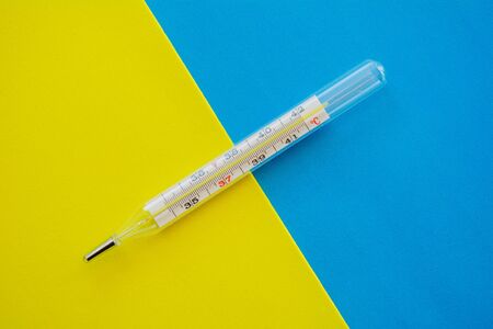 Glass mercury thermometer medical on a blue and yellow background to measure the temperature of patients with colds and flu.