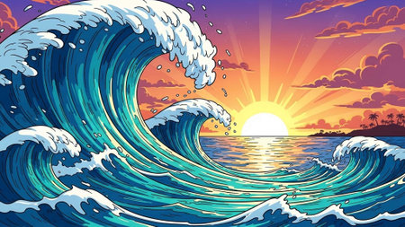 A vibrant ocean wave crashes at sunset with a colorful sky