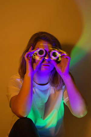 Close-up portrait of caucasian woman with ray of rainbow light on her face.