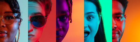 Collage made of half-faced portrait of different people, men and women of different age and race over multicolored background in neon light. Equality. Concept of diversity, emotions, lifestyle