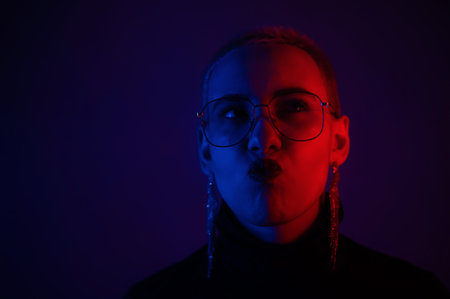 Close-up portrait of young blonde woman with short hair wearing glasses in neon light