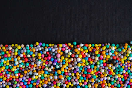 Colorful sprinkles on black background, top view. Space for text