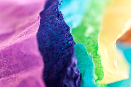 Multi-colored crumpled real vivid paper sheets texture background. Close up. Shallow depth of field.