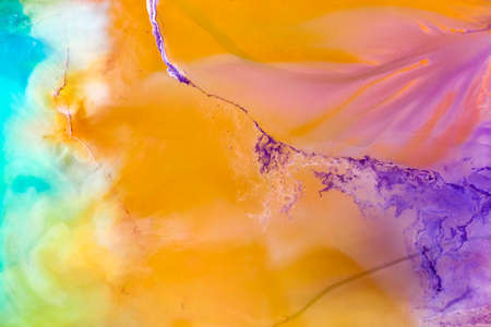 Colorful marble background.Mixed nail polishes-yellow,pink,blue and purple.Colorful marble background.Beautiful stains of liquid nail polish,fluid art technique.Pour painting technique.