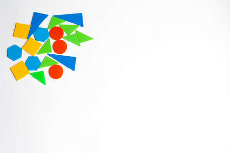 Geometric shapes of different colors on a white background flat lay copy space