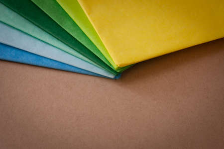 a stack of multi colored tissue paper spread out in a fan on a background of brown cardboard