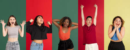 Group of people, young women and man posing isolated over multicolored background.