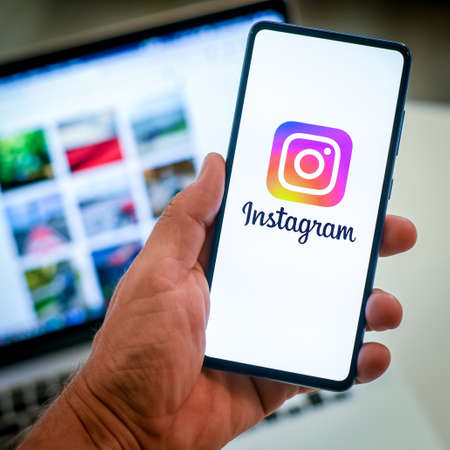 Close up view of hand with smartphone and Instagram logo on display. Laptop on background. New technology, social media, network, communication, concept. Squared image. Milan, Italy - October 2021