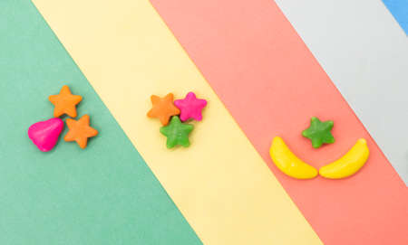 fruit shaped small candies over on colored background, top view