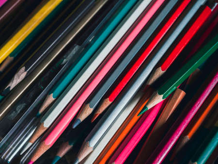 Colored pencils background. Close up various colors of old in used colored pencils on glass table in art studio, vintage tone style. Artist tools for making artworks.