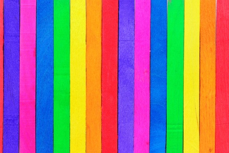 A close-up, top-down view of vertically aligned wooden planks painted in a spectrum of bright and pastel colors, showcasing subtle wood grain texture.
