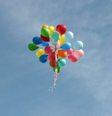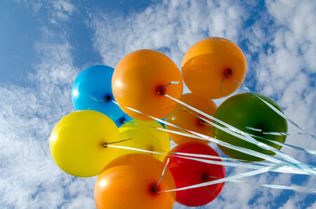 Multicolored balloons with ribbons fly in the sky against the background of a blue sky. Fly under the flow of the wind. A holiday in nature under the open sky.