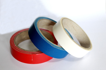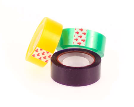 Rolls of insulation adhesive tape, multi colored ribbons on a white background