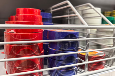 A variety of vibrant tape rolls in red, blue, and other colors are organized in a metal display rack at a craft supply store. The arrangement showcases creativity and organization.