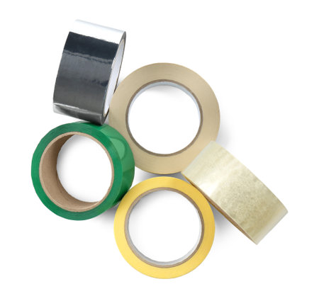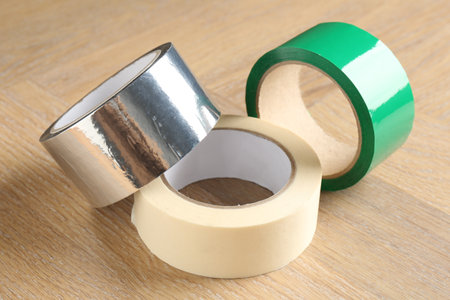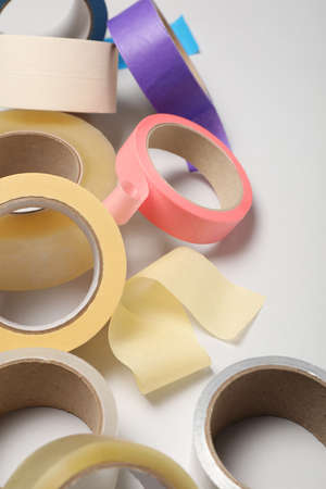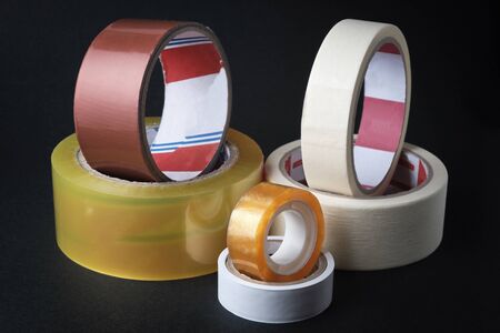 Several rollers of adhesive tape for different purposes. Paint and duct tape. Selective focus.