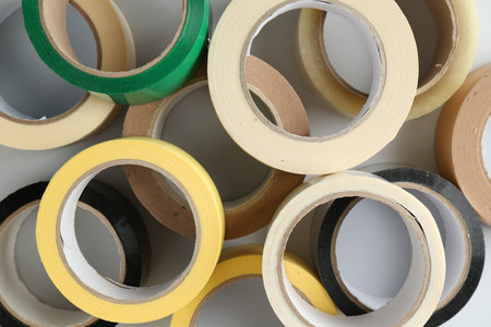 Construction colored adhesive tape, electrical insulating tape on a light background. Top view, flat lay.