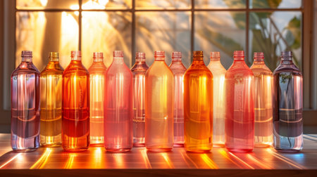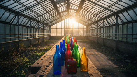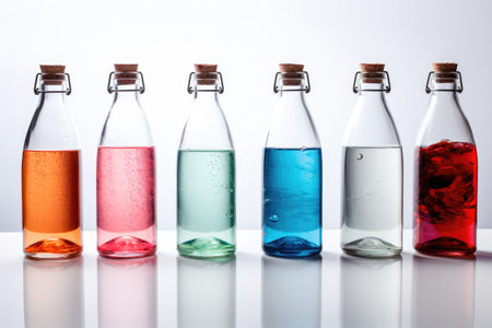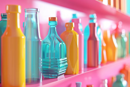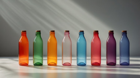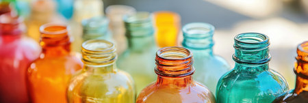 Vibrant and ecofriendly colorful glass bottles collection with a multitude of bright colors, soft light reflections, and transparent textures for recycling, decoration, and interior design purposes