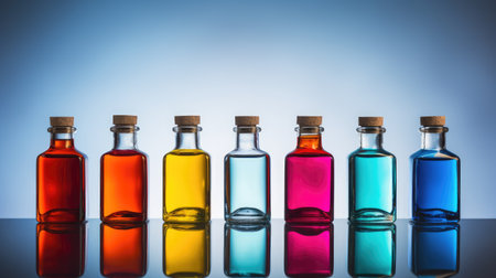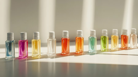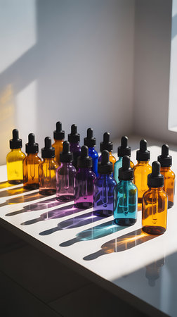 Colorful essential oils collection. Row of transparent bottles with rainbow-colored liquids arranged on reflective surface with soft window light creating shadows.