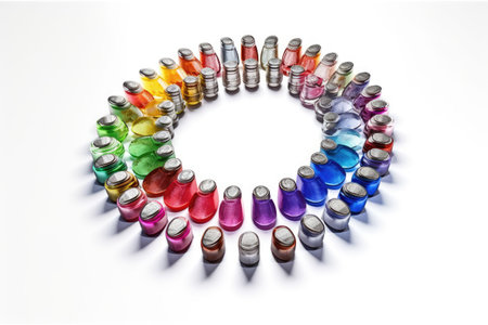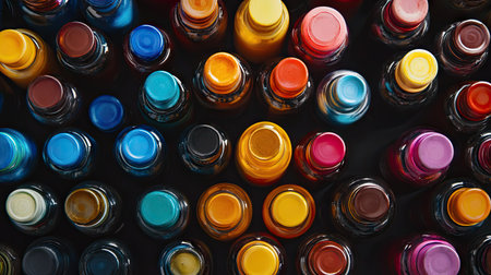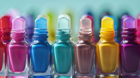 A vibrant assortment of nail polish bottles arranged in a striking spectrum of colors; perfect for illustrating beauty, creativity, and elegance in your projects.