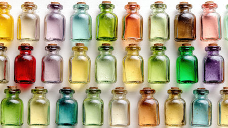 A grid of various small glass bottles displaying an assortment of colors, each with a distinct label-less design, arranged neatly on a light background, showing creative storage and decorative potential.