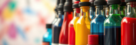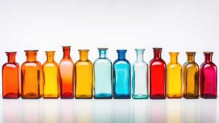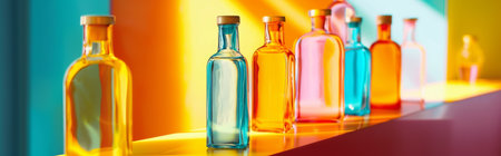 Colorful glass bottles lined up in bright light, emphasizing their vibrant hues and reflections. Ideal for themes related to design, decor, and vibrant aesthetics.