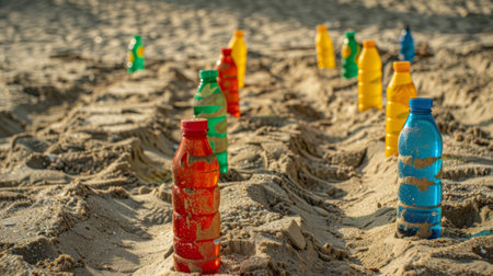 A collection of vibrant glass bottles arranged on a pebble beach, reflecting sunlight and adding a touch of charm to a peaceful outdoor setting with sparkling effects.