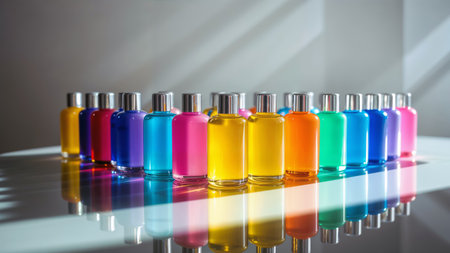 A row of colorful bottles of lotion and other toiletries. The bottles are arranged in a rainbow pattern, with each color representing a different brand. Concept of abundance and variety