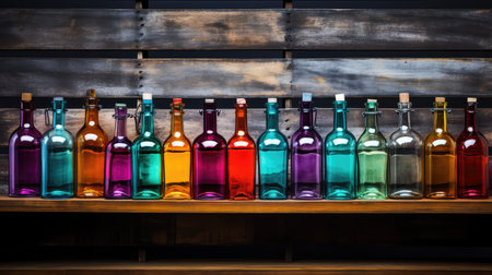 Colorful Glass Bottles Sparkling with Soft Light on Wooden Surface.