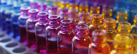 Small transparent bottles containing colorful chemical reagents are neatly arranged on a shelf, creating a gradient from blue to red to yellow