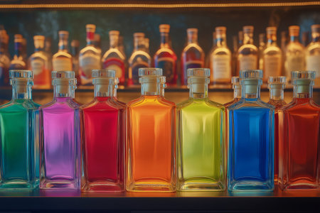 Variety of vibrant liqueurs displayed in glass bottles on a bar counter, creating a colorful and appealing presentation for customers