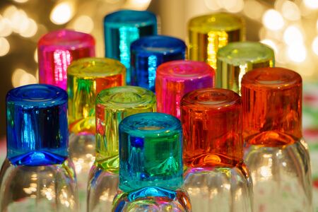 Colorful small glass bottles reflecting sunlight against black glass background.