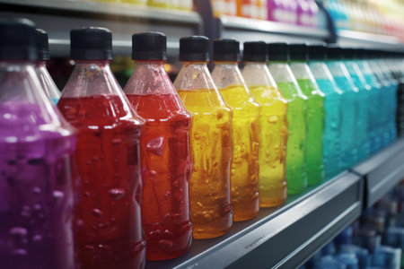 A row of colorful bottles neatly arranged on shelves, creating a vibrant and eye-catching display in a retail setting, perfect for showcasing products.