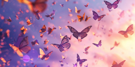 A mesmerizing scene showcasing numerous colorful butterflies fluttering against a breathtaking sunset sky, embodying nature's ethereal beauty and tranquility.