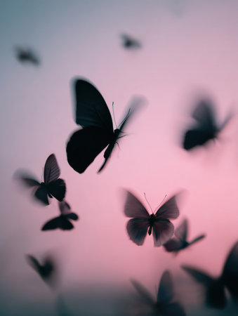 Colorful butterflies are seen fluttering in a soft pastel background, creating a lively scene in a natural setting during the early evening.