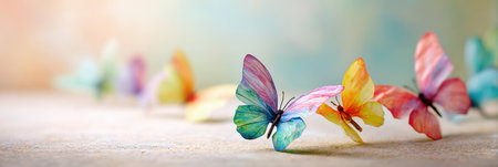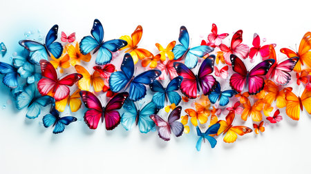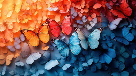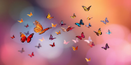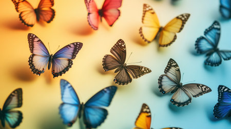 A stunning display of vibrant butterflies in various colors, gracefully flying against a soft gradient background, symbolizing beauty and freedom.