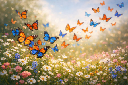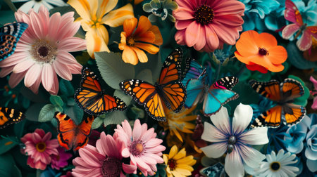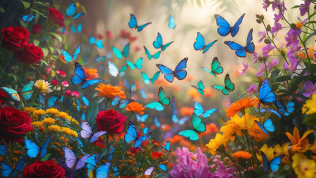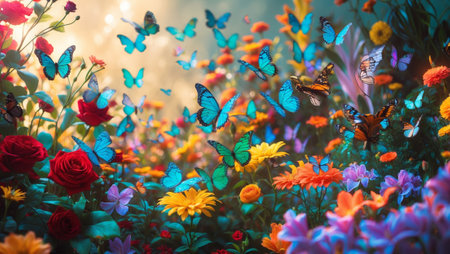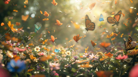 Colorful butterflies flutter in a vibrant flower garden during a sunny afternoon