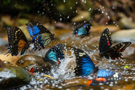 Vibrant butterflies gather on wet stones, basking in natures shower amidst a tranquil backdrop