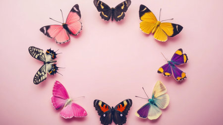 A stunning display of ten colorful butterflies arranged in a circle on a soft pink background, perfect for creative projects and nature-inspired artwork.