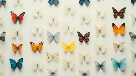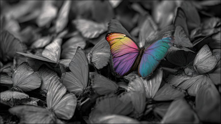 Vibrant butterfly with rainbow colors stands out against backdrop of monochrome butterflies, creating striking visual contrast that evokes sense of beauty and uniqueness