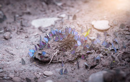 Group of butterflies puddling on the ground,Thailand Butterflies swarm eats minerals in Ban Krang Camp, Kaeng Krachan National Park at Thailand