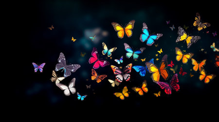 Multicolored butterflies on a black background with bokeh.