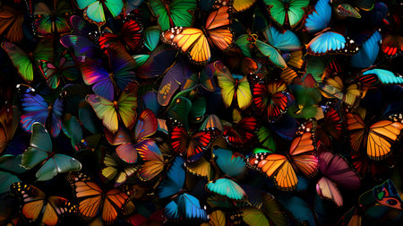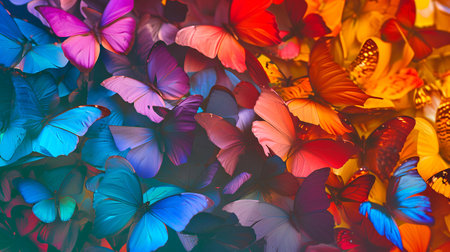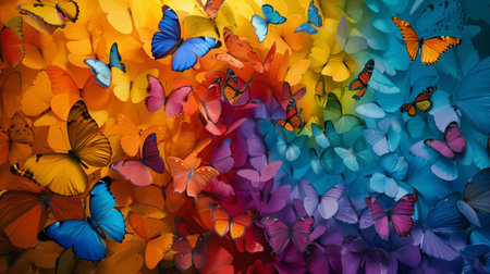 a vibrant rainbow of butterflies, each boasting unique colors and sizes, meticulously arranged to form an eye-catching pattern, evoking a sense of wonder and natural beauty SEAMLESS PATTERN.
