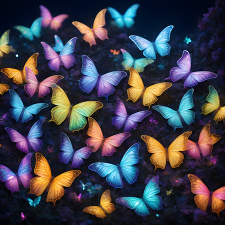 a lot of neon colored butterflies in the air
