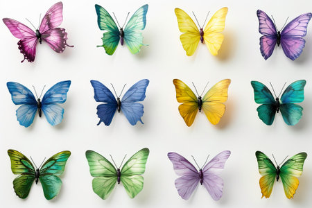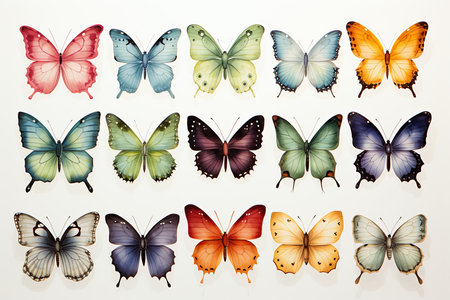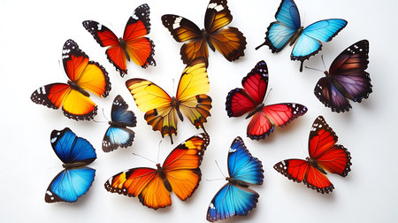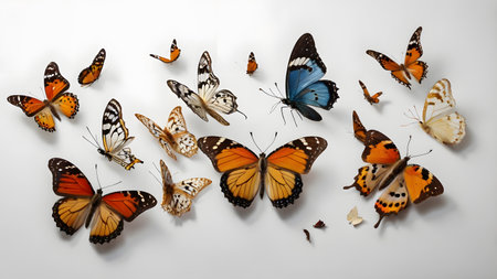 a vector set of butterflies featuring realistic color palette, birds-eye-view perspective, transparency, and lightness. the meticulous design by duy huynh showcases flat colors against a white background. this butterfly clip art collection captures the beauty of these delicate creatures in a visually stunning way. ai generated