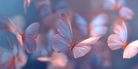 surreal scene with soft pastel butterflies flying through dreamy pink and blue light